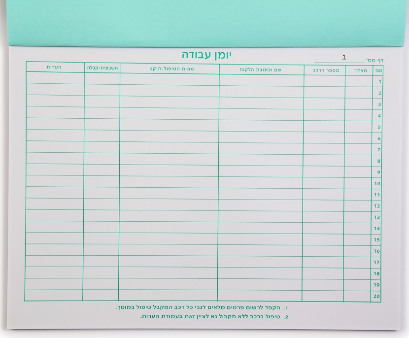 יומן לניהול ומעקב שוטף של כל העבודות שבוצעו במוסך ברשימה מסודרת.